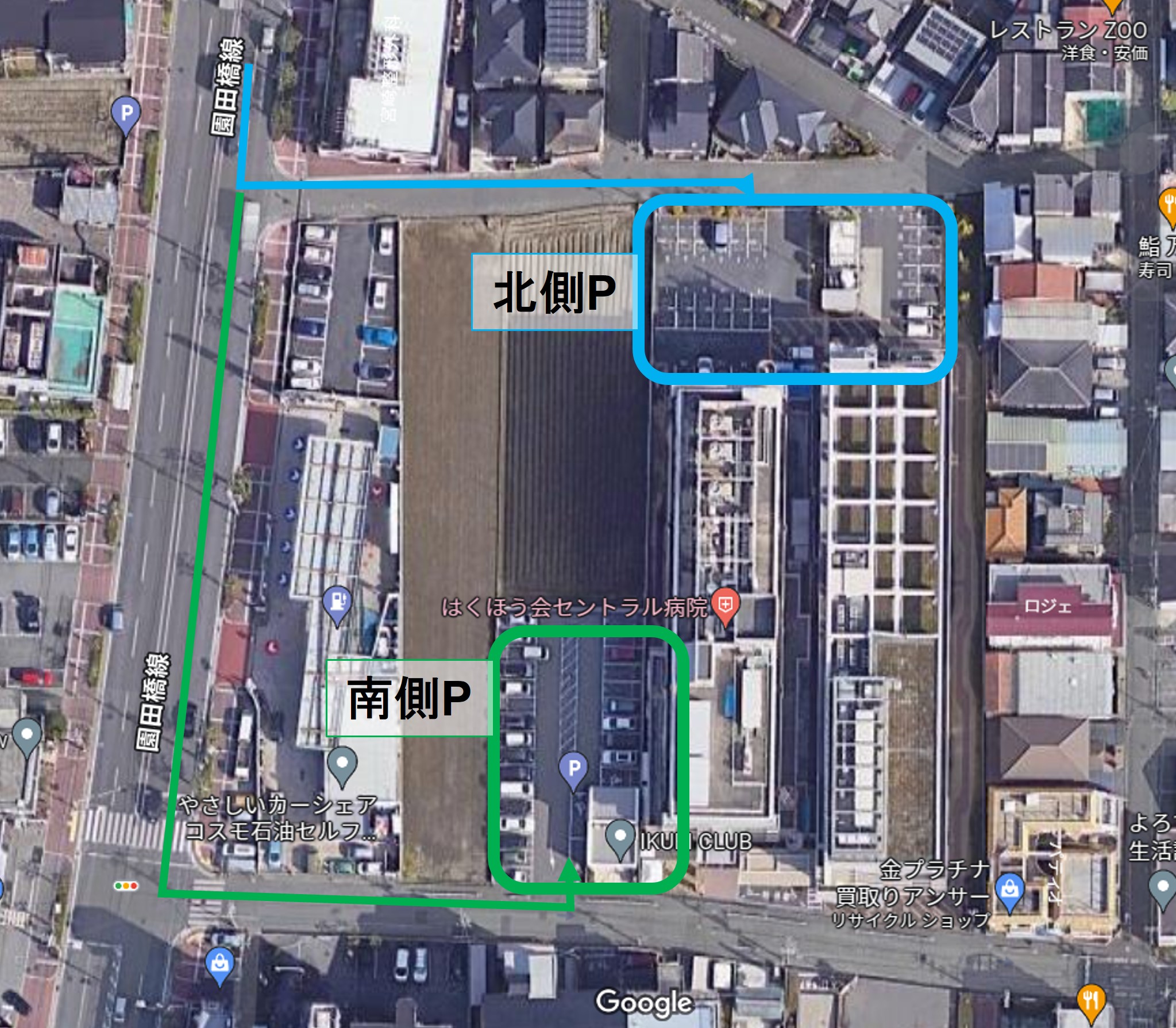 病院駐車場は北側と南側に2箇所あります。