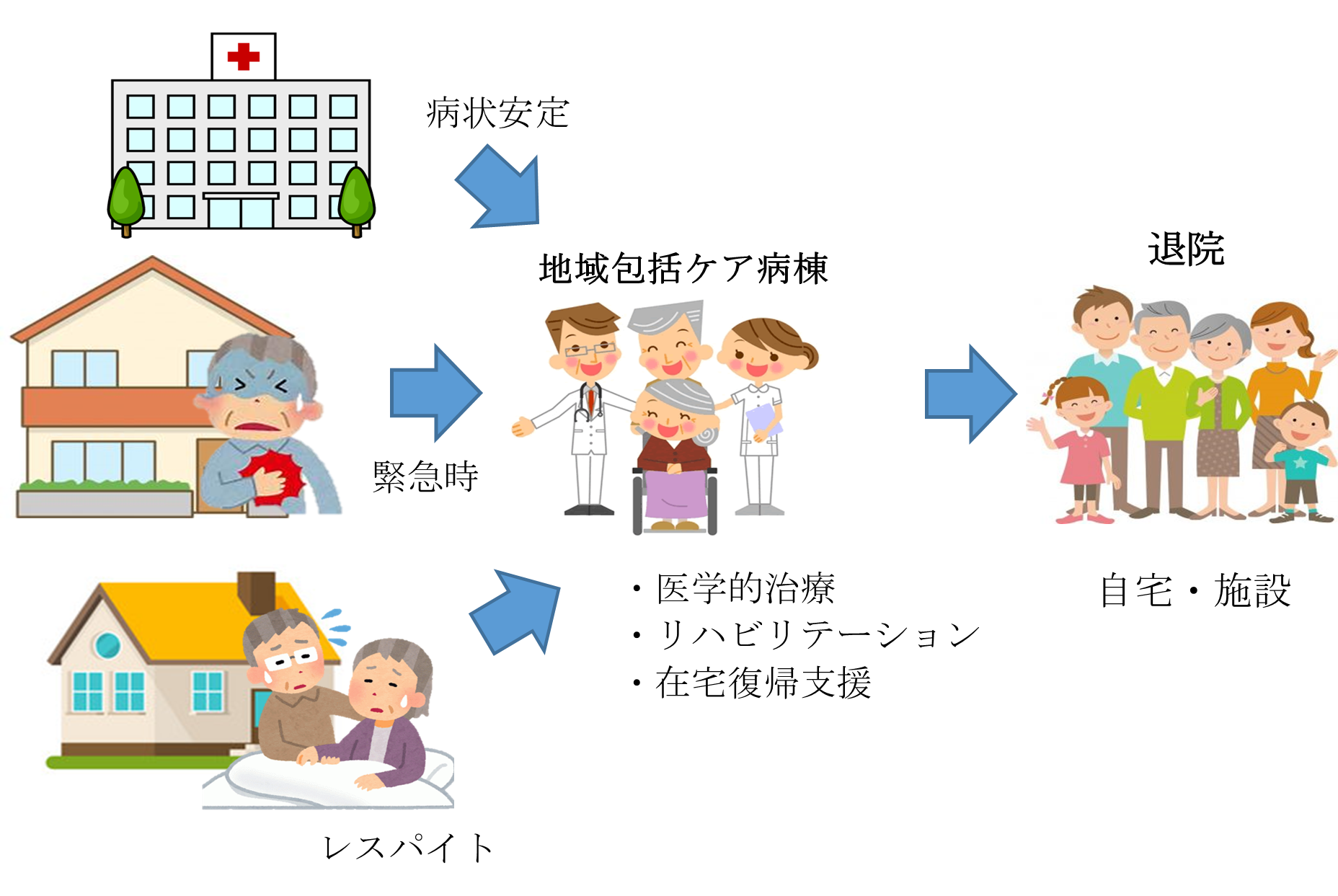 介護施設や在宅で療養中に入院が必要となった患者様に対して、再度介護施設や在宅へ向けて医療、看護、リハビリを行っています。