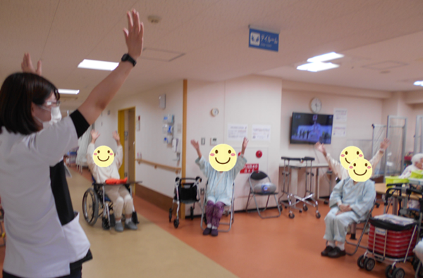 看護師とリハビリセラピストが協力して、集団リハビリを実施しています。毎日1時間程度、患者様と共に運動やレクリエーションを行っています。