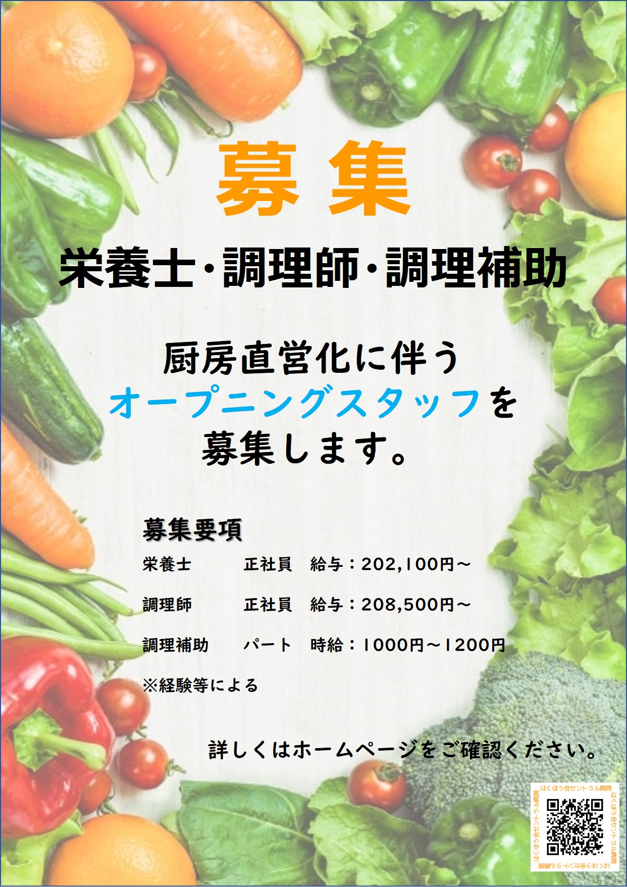 募集職種は「栄養士」「調理師」「調理補助」となります。