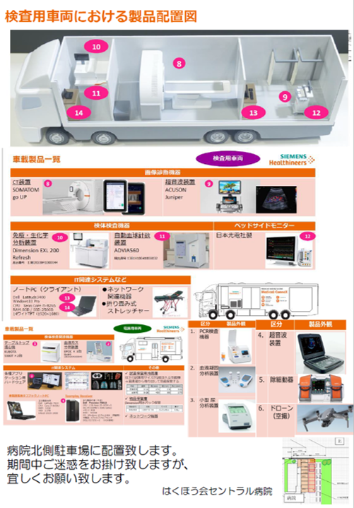 放射線科・放射線部ではCT装置(世界初のIntelligent CT <128 スライス CT> )の新規導入に向けて準備を開始いたします。CT装置入れ替えは11月下旬~12月初旬までとなります。この間CT検査が行えないことを回避するために、伯鳳会グループが、ドイツのシーメンス社と共同開発した「Medical-ConneX(メディカルコネックス)」を当院に運び込み、このCT装置を積載した移動型検査車を使用してCT検査を継続します。