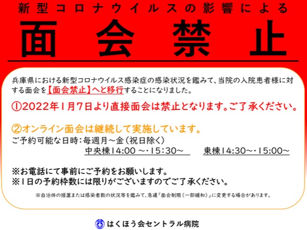 兵庫県内の新型コロナウイルス感染症の感染状況を鑑みて、2022年1月7日から入院面会を禁止とします。