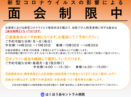 兵庫県内の新型コロナウイルス感染症の感染状況を鑑みて、2023年5月8日(月)より入院患者様への面会制限を更に緩和いたします。