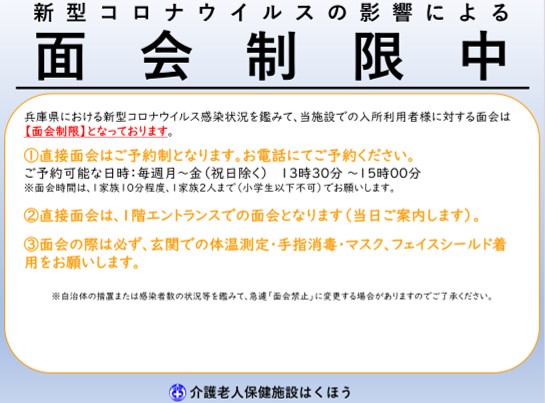 menu 施設のご紹介 施設のご紹介 ごあいさつ 施設概要 重要事項説明書 入所サービス 通所サービス ショートステイ 訪問リハビリ 求人募集 交通アクセス お知らせ 施設のご紹介 施設のご紹介 ごあいさつ 施設概要 重要事項説明書 入所サービス 通所サービス ショートステイ 訪問リハビリ 求人募集 交通アクセス 06-4960-8940 兵庫県尼崎市若王寺3丁目13番20号 お知らせ 面会制限についてのお知らせ 2022.10.25 2022年10月24日(月)から面会禁止を一部緩和し、面会制限へ移行致します。 入所利用者様への直接面会はご予約制となっております。 事前にお電話でご予約をお願いします。また、1日にお受けできるご予約数には限りがございます。 ご希望日に沿えない場合がございますので、何卒ご理解の程お願い申し上げます。