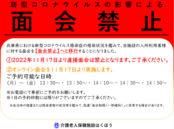 兵庫県内の新型コロナウイルス感染症の感染状況を鑑みて、2022年11月17日から入所者様への面会を禁止とさせて頂きます。