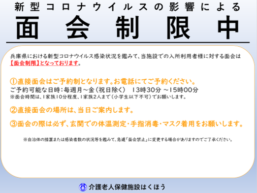 menu 施設のご紹介 施設のご紹介 ごあいさつ 施設概要 重要事項説明書 入所サービス 通所サービス ショートステイ 訪問リハビリ 求人募集 交通アクセス お知らせ 施設のご紹介 施設のご紹介 ごあいさつ 施設概要 重要事項説明書 入所サービス 通所サービス ショートステイ 訪問リハビリ 求人募集 交通アクセス 06-4960-8940 兵庫県尼崎市若王寺3丁目13番20号 お知らせ 面会禁止の緩和について 2023.03.09 2023年3月13日(月)から面会禁止を一部緩和し、面会制限へ移行致します。 入所利用者様への直接面会はご予約制となっております。 事前にお電話でご予約をお願いします。また、1日にお受けできるご予約数には限りがございます。 ご希望日に沿えない場合がございますので、何卒ご理解の程お願い申し上げます。