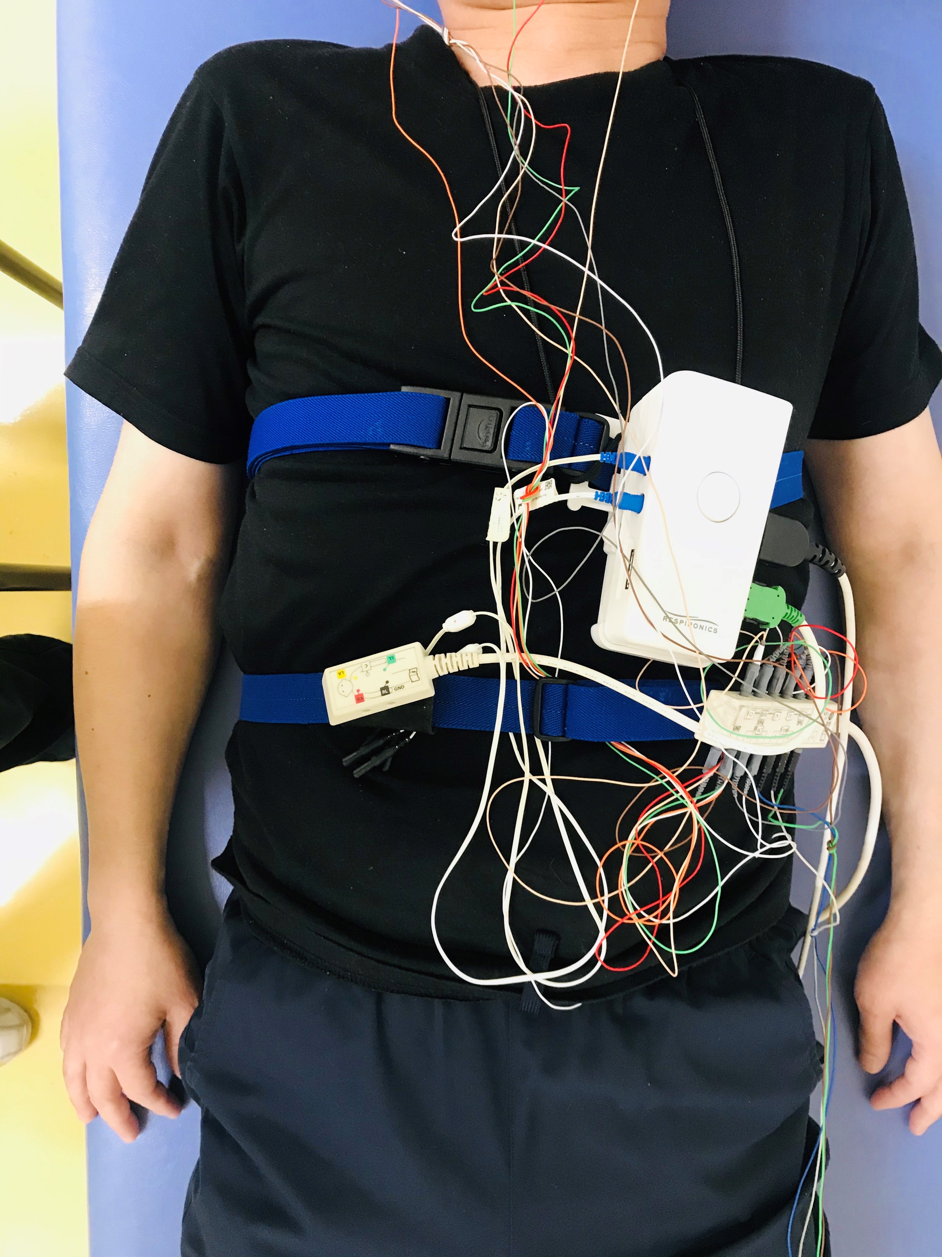 簡易検査の結果から、さらに詳しく検査する必要がある場合は、1泊2日入院の精密PSG検査(ポリソムノグラフィー検査)を行います。なるべく仕事や日常生活へ支障が出ないよう、夕方に入院して検査を実施し、翌朝出勤前に退院できるよう配慮をしています。 精密検査では、口と鼻の気流、血中の酸素飽和度、胸部・腹部の換気運動、筋電図、眼電図、脳派、心電図、いびきの音、睡眠時の姿勢など、非常に幅広い項目を検査し、睡眠と呼吸の「質」の状態を調べます。これらの項目を測定する目的で身体に多くのセンサーや電極をつけるため、装着に1時間半程度の時間がかかります。しかし、痛みを伴うような検査ではなく、簡易検査と同様に寝ている間に検査は終了します。