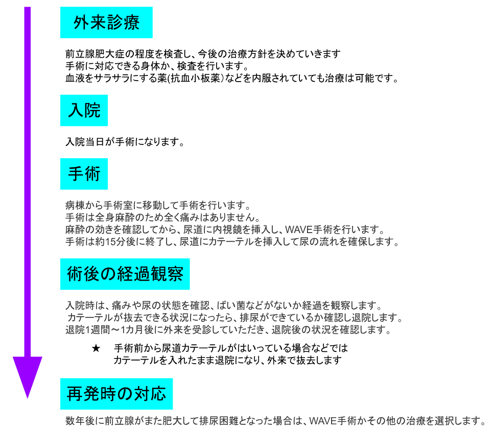 経尿道的水蒸気(WAVE)治療(以下、本治療)は、前立腺肥大症の手術方法の1つで、内視鏡を用いて尿道から入り、水蒸気を利用して前立腺肥大症を治療するもので、Rezūmシステムで行います。 水蒸気が、肥大した組織内に蔓延し、細胞を壊し、その細胞が体内に自然に吸収されていくことで、前立腺肥大症に伴う症状を緩和します。